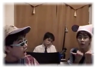 (Subtitle for Picture-on-the-Right: Me (I'm wearing the Disneyland cap), Josh (with the silly blue sunglasses), and some weird kid named Skye singing together. (He's playin' zee piano!))